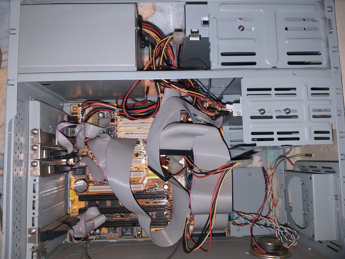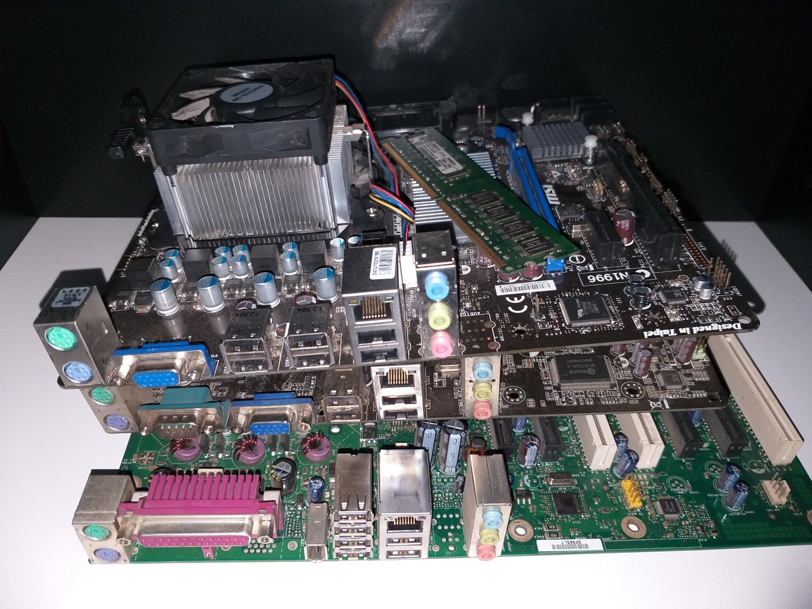 Komputer "z Sekretariatu firmy" - płyta prawdopodobnie ECS na 775, Celeron D lub jakiś P4, 1,5GB RAM DDR2, HDD 80GB + 40GB IDE (Maxtor DiamondMax Plus 8 i 10), DVD Samsung, FDD, zasilacz Deer z 2006, licencja XP Home